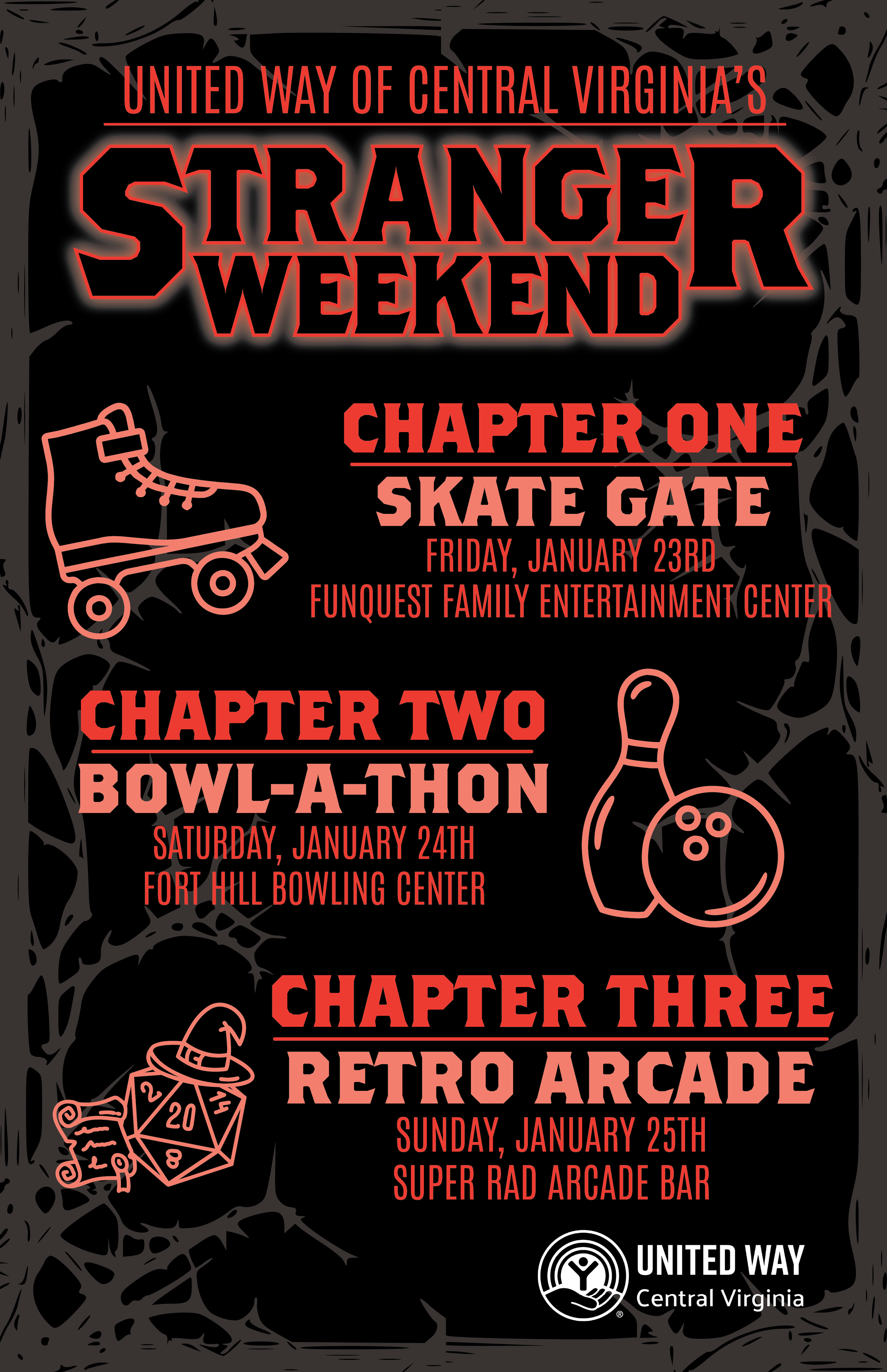For every entry to FunQuest on Friday January 23rd, a portion of your ticket will benefit United Way of Central Virginia. Bring your family, eat, drink, skate and play for a great cause!